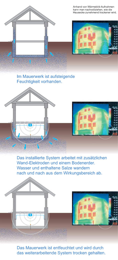 Die hochwertigen Anoden werden bei feuchten Mauern im Mauerwerk verlegt. Sie werden mit dem Steuergerät verbunden und erhalten eine gesteuerte Gleichspannung zwischen 5 und 15 Volt. Hieraus resultiert ein permanent arbeitendes, schwaches elektrisches Feld. Normalerweise hat ein Mauerwerk ein negatives elektrisches Potenzial. Durch die Spannung wird dieses in ein positives Potenzial umgewandelt. Der daraus entstehende Effekt stoppt die aufsteigende Feuchtigkeit in den Mauern und verhindert darüber hinaus künftig ein erneutes Aufsteigen. So kann das Mauerwerk mit Drymat® M2030 EO+ effektiv und nachhaltig trockengelegt werden.